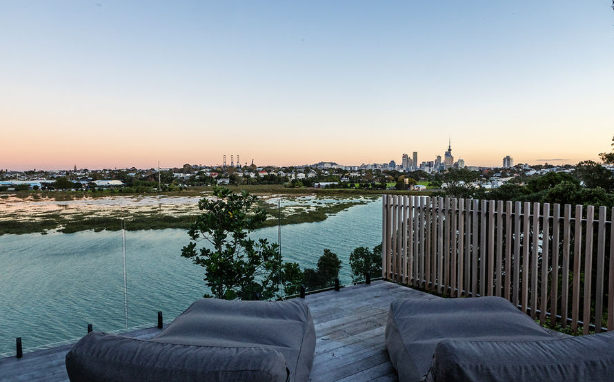 The house folds around a modest lawn with a cantilevered pool & deck extending over the cliff, providing amazing city views. As the deck extends under a large native Pohutukawa tree, it feels like you are flying over the sea itself and is the perfect place to watch the sunset over the city.